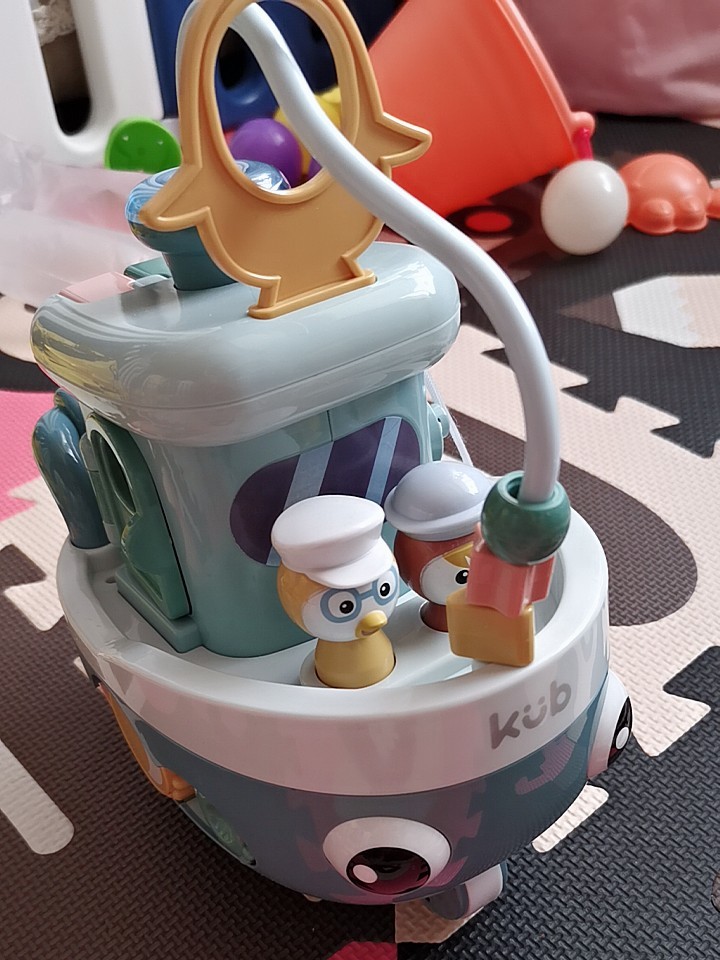 🔻 Kết hợp nhiều tương tác trên 1 con tàu đầy sắc màu: 2 chàng thủy thủ chim cánh cụt; một cần câu cá; nhấn nút cá voi, rùa và bạch tuộc thì bé sẽ được nghe cái bài hát và giai điệu cũng như được nghe kể chuyện (Tiếng Trung); trên cánh buồm là những khối để luồn hạt; phía bên kia là cánh cửa tàu mà mỗi khi được mở ra cửa sẽ kêu đing; những thủy thủ ra khơi luôn quan tâm đến thời tiết nên có những khối thể hiện thời tiết trên biển; có đèn led; có khối xoay bi; có bánh lái xoay vòng vòng; có 3 note nhạc.